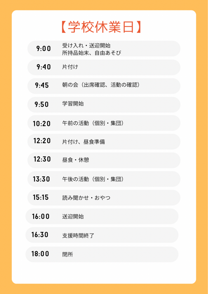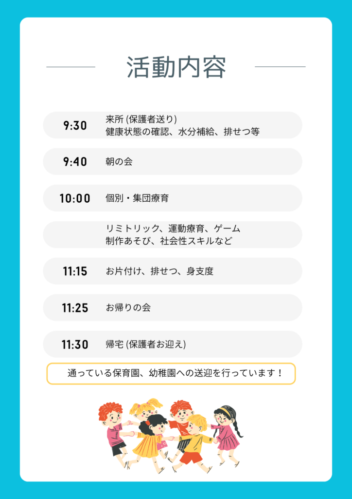 「元気に!いきいきと!」をテーマに事業を行っています。”あそび” を通して、運動・認知・ことば・社会性などを身に着けていけるように、一人ひとりの発達段階・個性に合わせた内容で支援していきます。